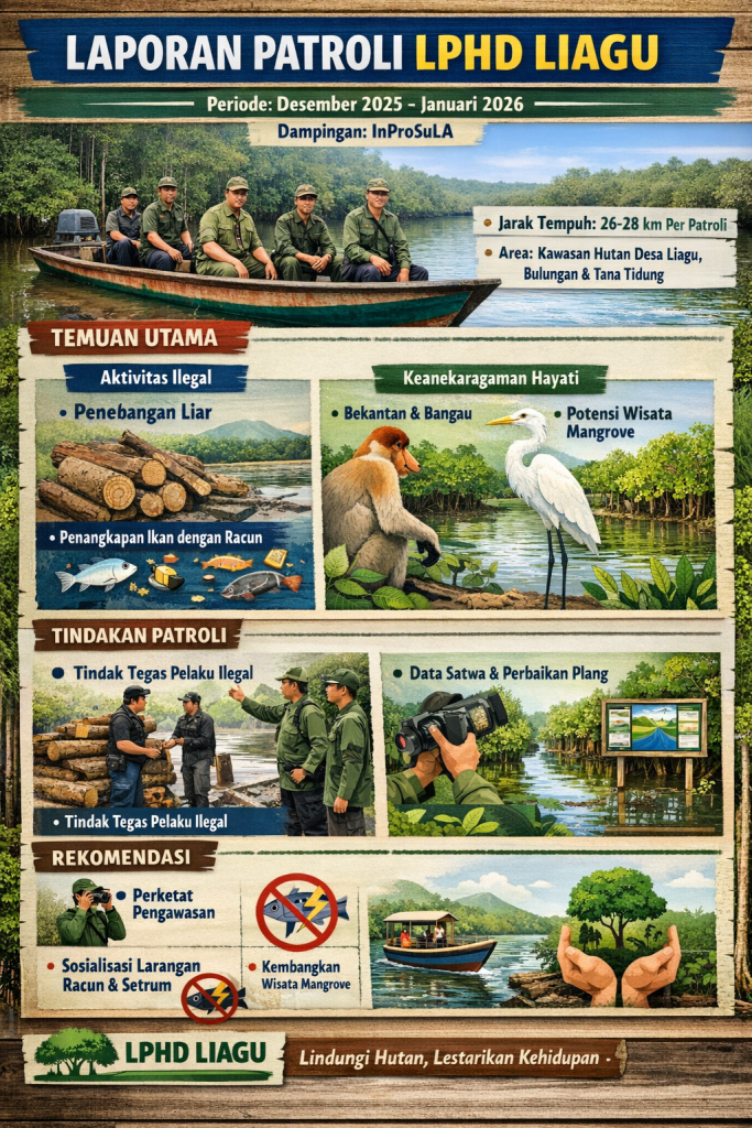 Pada periode akhir Desember 2025 hingga awal Januari 2026, tim patroli LPHD Liagu telah melaksanakan dua kegiatan patroli, yaitu pada tanggal 26 Desember 2025 dan 8 Januari 2026. Total jarak tempuh patroli masing-masing mencapai 28,38 km dan 26,49 km dengan cakupan wilayah hutan desa, termasuk area mangrove dan kawasan yang relatif jauh dari pemukiman masyarakat.