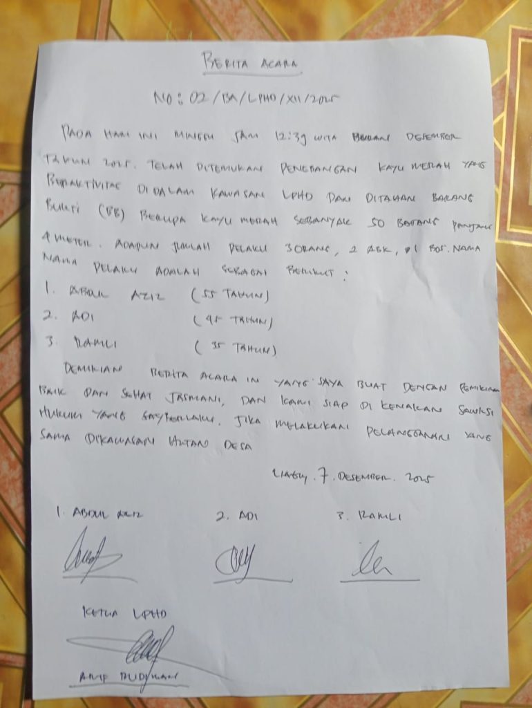 Dalam kegiatan ini tim patroli hutan desa Liagu menangkap tiga orang pelaku pelanggaran yaitu Abdul Azis, Adi dan Ramli yang kesemuanya adalah warga Tarakan. Ketiga pelaku kemudian dibawa ke Desa Liagu yang kemudian diberikan edukasi dengan memberikan informasi tentang hutan desa Liagu dan kemudian dibuatkan berita acara penangkapan. Berita acara ini dibuat agar pelaku tidak mengulangi tindakannya di waktu yang akan datang.