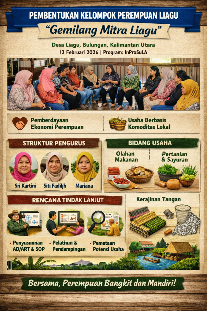 Inprosula melakukan inisiasi pembentukan kelompok perempuan di Desa Liagu dilaksanakan untuk memperkuat peran perempuan dalam pengelolaan ekonomi desa melalui usaha berbasis komoditas lokal. Pertemuan yang diadakan pada bulan Februari 2026 di Gedung Sanggar Seni dihadiri oleh berbagai kelompok masyarakat dan LPHD Liagu.